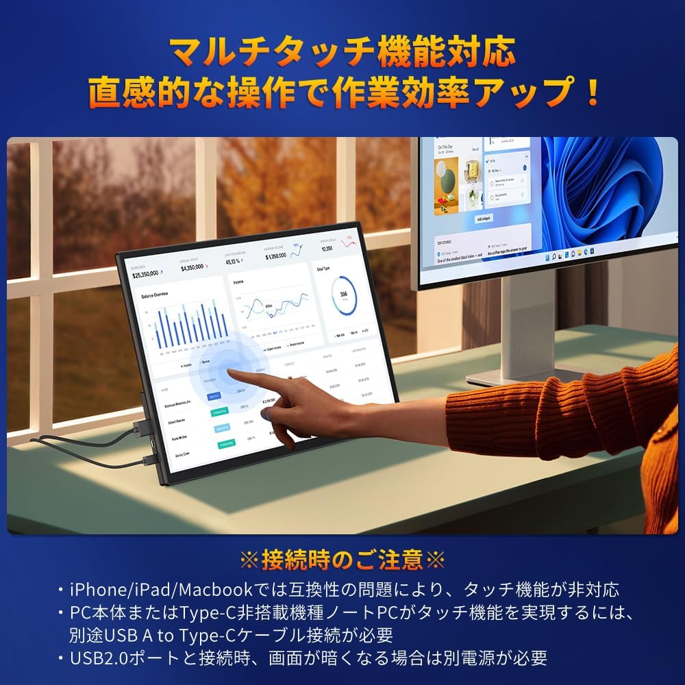 【直感的なタッチ操作で、効率と没入感が大きく広がる】 21.5インチの大画面にタッチパネルを搭載した、ビジネスからクリエイティブ、エンターテインメントまで、あなたの「やりたい」をスムーズに実現します。(*ご注意:HDMIでPCと繋ぐ場合、HDMIケーブルはタッチ信号を転送できないため、同時にUSB A-USB CケーブルでPCとモニターを繋ぐ必要があります。)※ご注意:iPhone/iPad/Macbookと接続する場合、iOSの仕様によりタッチ操作はご利用いただけません。画面の映り込みのみとなります。Android端末やWindows PCではタッチ操作が可能です。