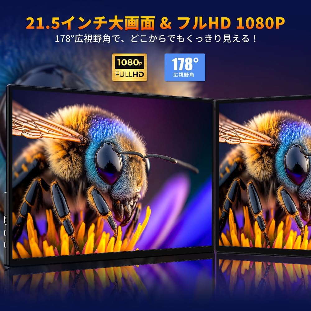 【スマートなデザイン】 (1)いつでも、どこでも、仕事もゲームも没入感が違う。 21.5インチの大画面を、スリムで軽量なボディに凝縮した、次世代のポータブルモニターです。ノートPCのサブディスプレイとして、ゲーム機の大型画面として、出張先での業務効率化として、あなたの可能性を大きく広げます。(2)左側にtypeC端子*2とHDMI端子*1があります。様々な機器に接続できます。右側にイヤホンジャック、メニューボタン、電源ボタンがあります。 (3)このモバイルディスプレイはステレオスピーカーを内蔵しています。二つの1Wの大音量スピーカーですので、音が小さいのが心配しません。また、3.5mmオーディオ端子も付き、外付けスピーカーかイヤホンをつけるかお好みに合わせて選択できます。 (4)スタンド下側に滑り止めゴムが付き、しっかりと本体を支え、作業、自分の好みによって適切な角度に調節可能です。さらに、背面標準VESAマウント(75mm x 75mm、ネジ規格:M4x 4mm)対応で、デスク上での使い方がもっと自由に。