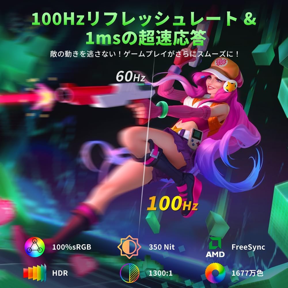 【多彩なデバイスに対応】 ノートパソコン、デスクトップPC、スマートフォン、PS4/PS5、Xbox One、Wii、Nintendo Switchなど、さまざまな機器と接続可能。低遅延でゲームプレイにも最適です。追加のドライバーインストールは不要ですぐに使用でき、100Hzの高速応答によりFPSゲームやアクション映画など動きの速いコンテンツも滑らかに表示。拡張モード・複製モードの両方に対応し、縦表示・横表示も簡単に切り替えられます。