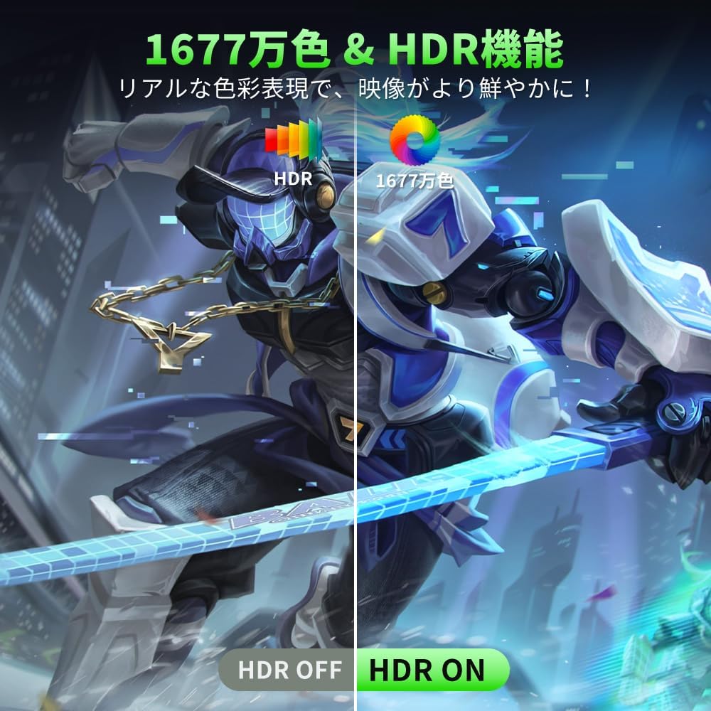 【IPSノングレアパネル&フルHD対応&ブルーライト軽減】 (1) 光の反射を抑えたノングレアIPS液晶パネルを採用。広視野角(最大178度)を実現し、どの角度からもくっきりと美しい映像をお楽しみいただけます。 (2) 解像度は1920×1080のフルHDに対応。ゲームや映画を臨場感あふれる画質で体験できます。 (3) ブルーライト軽減モードを搭載。目に優しい紙のような色温度を再現し、長時間のゲームや作業でも目の疲れを軽減します。