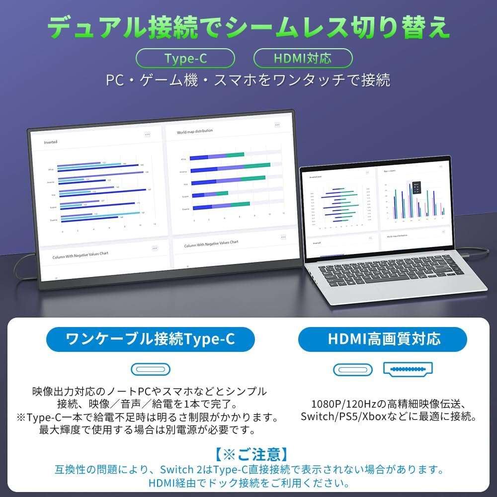 【USB-C 1本&HDMI接続方法】 (1) USB-C 1本接続:お使いの端末がDP Alt Modeに対応している場合、付属のType-C to Type-Cケーブル1本で映像・音声・給電を同時に転送可能です。付属のUSBアダプタと電源ケーブルを使用してモニターに給電すれば、接続したPCやスマートフォンへの給電も同時に行えます。コントラストや輝度、音量を最大限に引き出すには、付属の電源アダプターを使用して安定した電力を供給してください。 (2) HDMI接続:市販のほとんどのHDMI対応機器と接続可能。付属のHDMIケーブルを使用する場合は、別途USBケーブルでの給電が必要です(HDMIケーブルは映像・音声信号の転送のみ対応)。