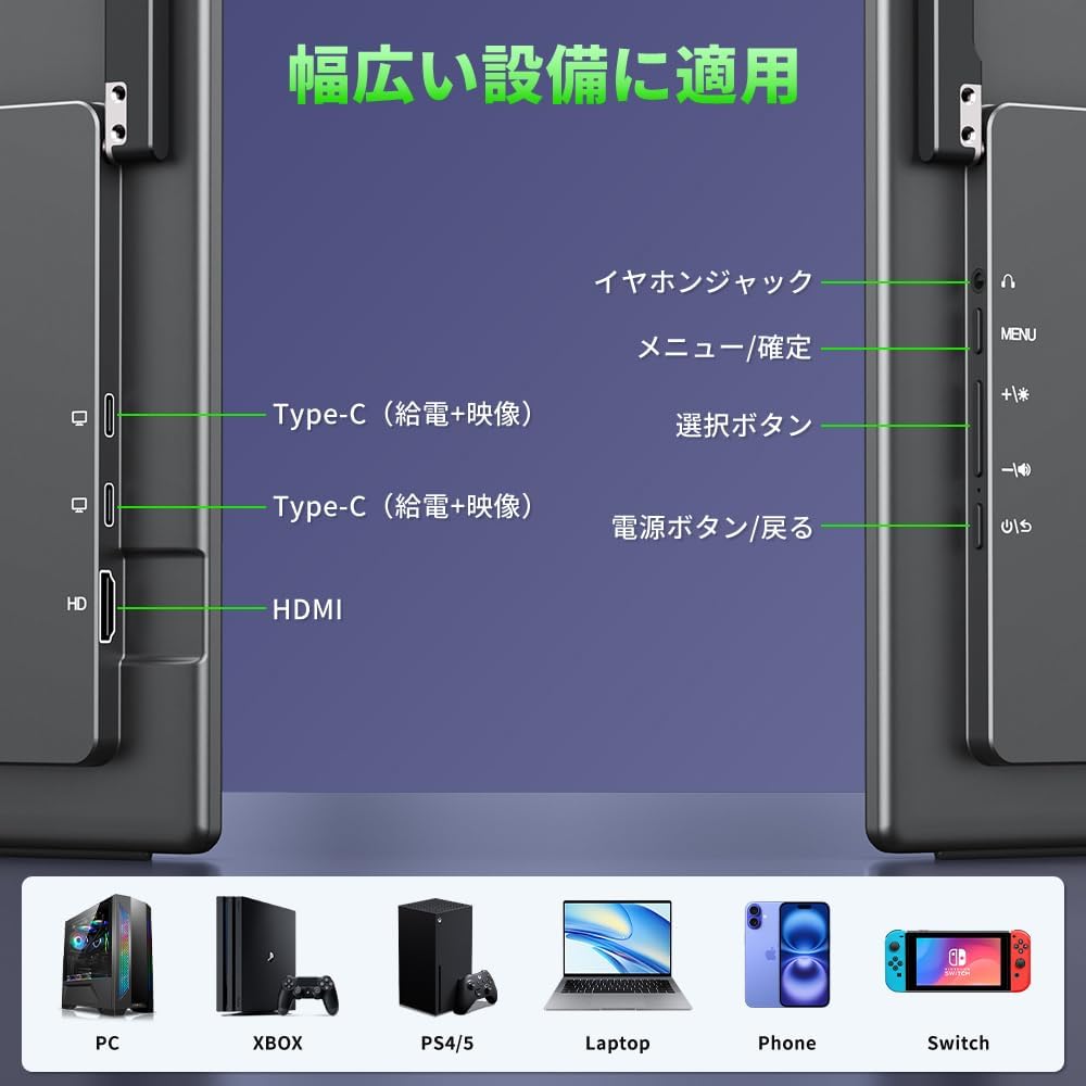 【スマートで洗練されたデザイン】 (1) どこでも、仕事にも遊びにも没入できる体験を。23.8インチの大画面をスリム・軽量ボディに凝縮した次世代ポータブルモニター。ノートPCのサブやゲーム機の大画面化、出張先での業務効率化など多彩に活用できます。 (2) 左側にType-C×2とHDMI端子、右側にイヤホンジャック・メニューボタン・電源ボタンを配置し、操作性も抜群。 (3) ステレオスピーカーを内蔵し、高音質で滑らかな動画再生やゲームプレイ、Web会議をサポート。2つの1Wスピーカーで十分な音量を確保しているため、音声の聞き取りに不便を感じません。また、3.5mmオーディオ端子も装備しているため、外部スピーカーやヘッドホンの使用も可能です。 (4) 一体型スタンドを採用し、本体やスタンド底部には滑り止めゴムを配置し、安定した設置を実現。0~180度の広範囲な角度調節が可能で、視聴や作業に最適なポジションを簡単に設定できます。さらに背面にはVESAマウント(100mm x 100mm、ネジ規格:M4 x 6mm)に対応しており、デスク上での自由度が広がります。